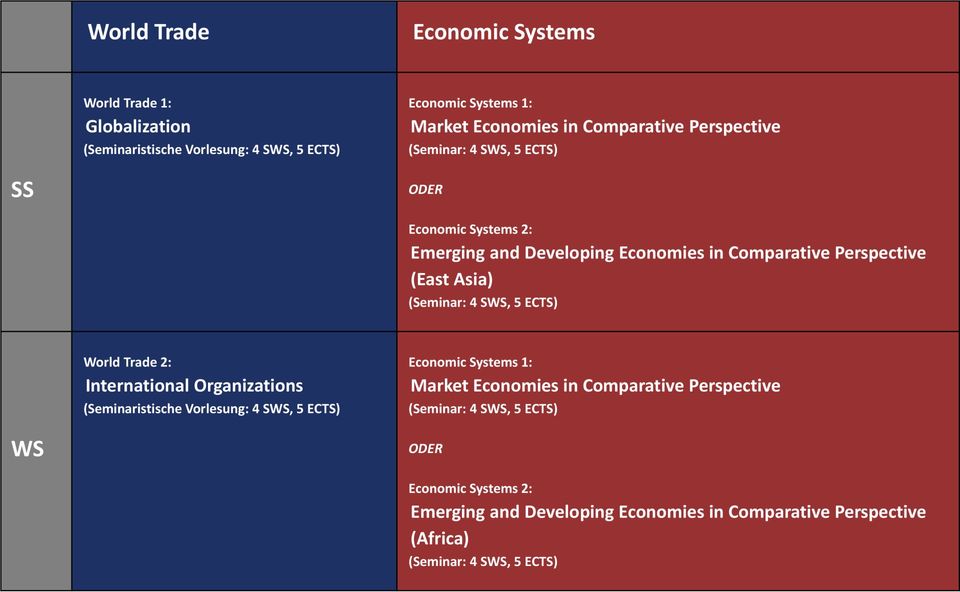 Das Fachprofil besteht aus zwei Pflichtveranstaltungen zum Welthandel (Globalization, International Organizations) sowie zwei Wahlpflichtveranstaltungen mit Fokus auf die Wirtschaftssysteme einer Weltregion (Ostasien oder Afrika, Europa). In unregelmäßigen Abständen wird durch einen Lehrbeauftragten ein besonderes Modul über Korea (Economy and Society of Korea) angeboten.
