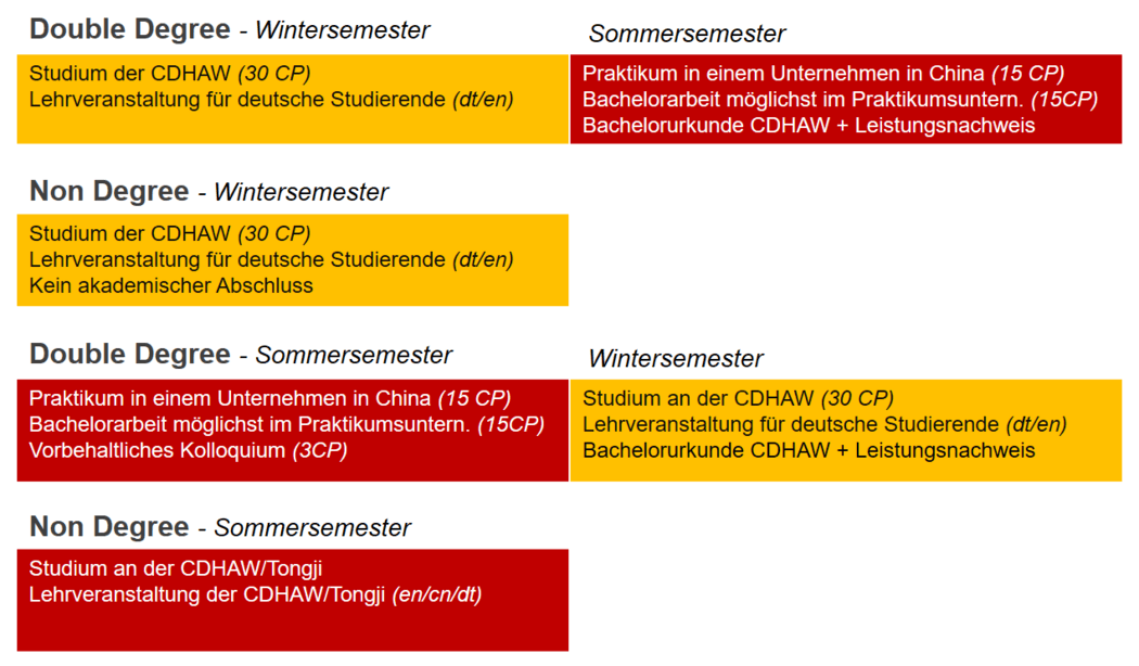 An der CDHAW können die Studiengängen Mechatronik, Fahrzeugtechnik, Gebäudetechnik und Wirtschaftsingenieurwesen studiert werden. Im Rahmen dieser Bachelor-Doppelabschlussprogramme können Studierende der WHZ zwei Semester in China studieren und zusätzlich einen Bachelorabschluss der Tongji Universität erhalten ("Double Degree"). Es ist aber auch ein einsemestriger Studienaufenthalt ("Non Degree") möglich.